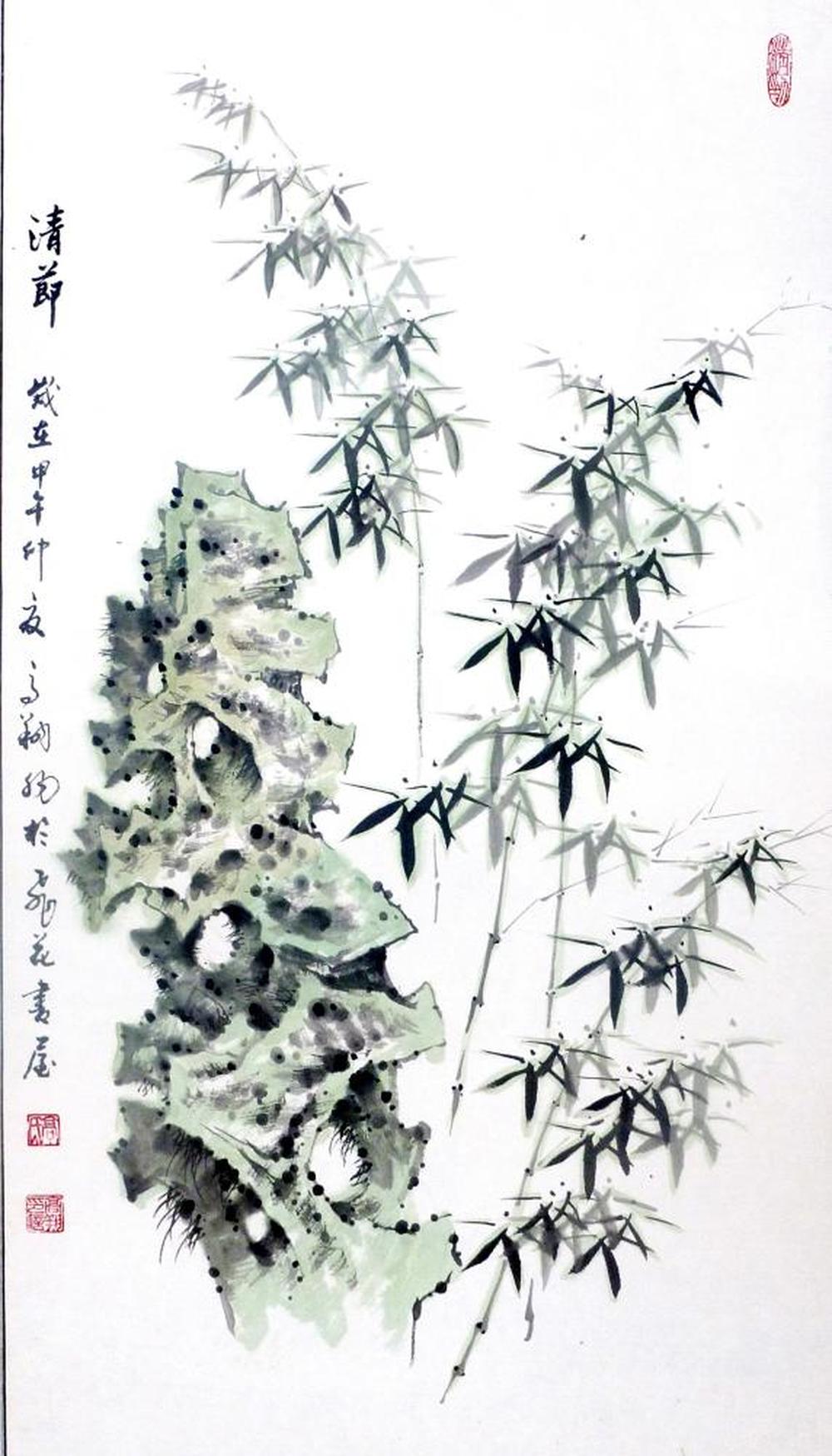 此图重在表现竹的“清”,湖石也用清劲的笔法来写,力求突出“清”字。